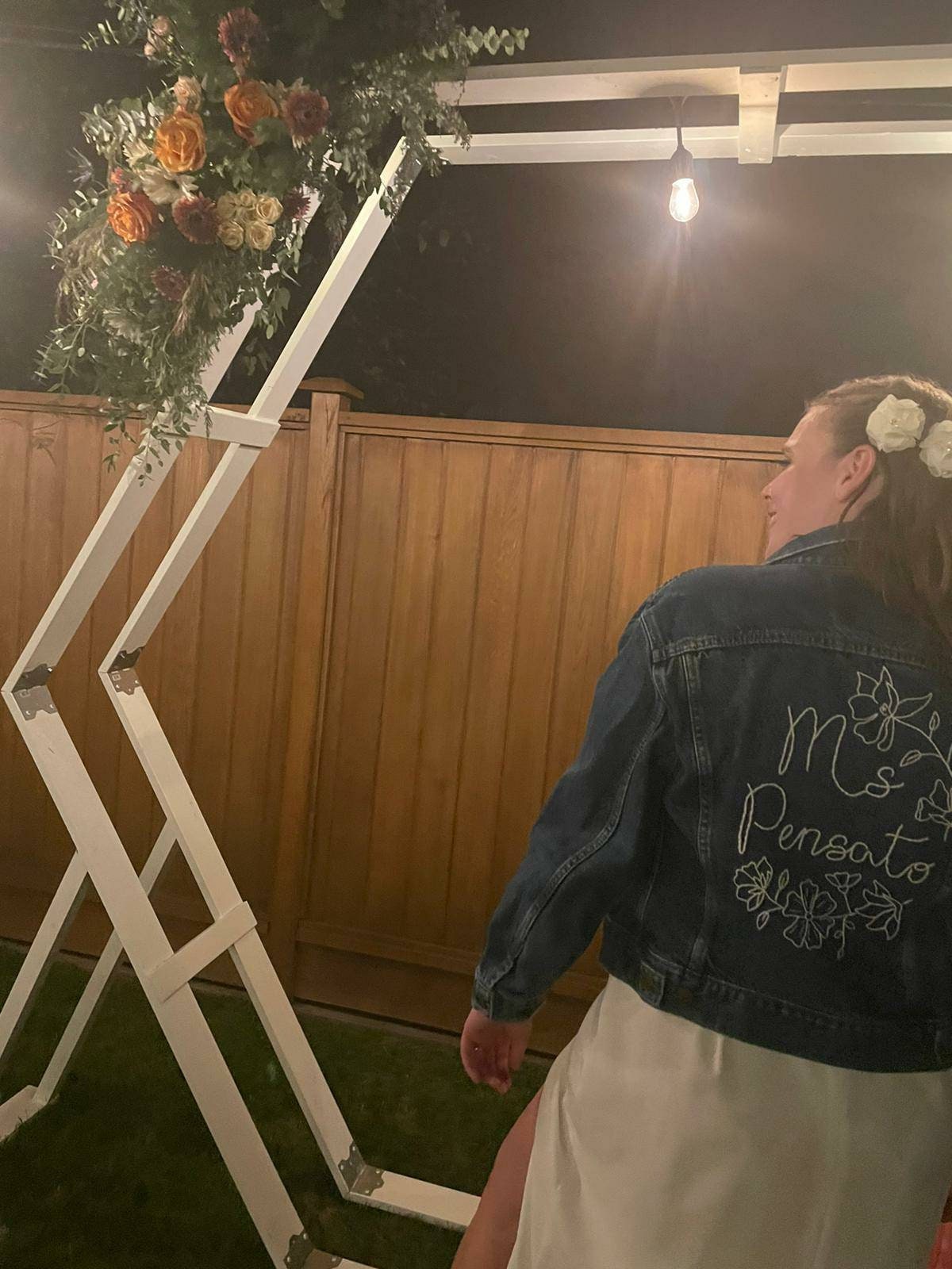 A hand embroidered denim jacket that will add a unique piece to you photos and special day. Jackets are customized to match the flowers and theme of wedding.